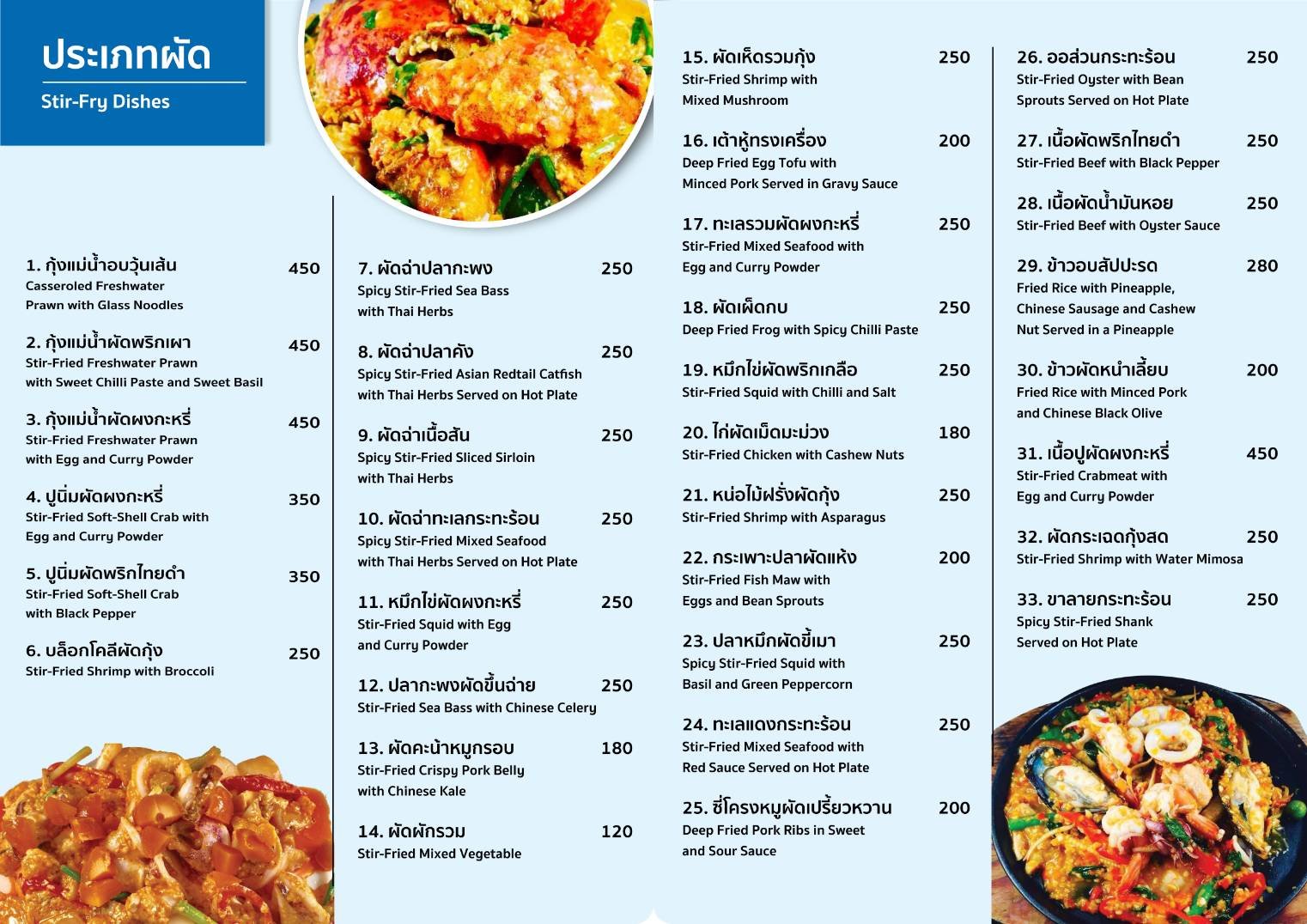 เมนูผัดเป็นหนึ่งในไฮไลต์ของร้าน มีให้เลือกมากกว่า 30 รายการ เช่น